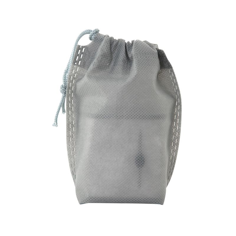 Presentación en bolsa non woven gris con cordón y caja kraft de regalo.