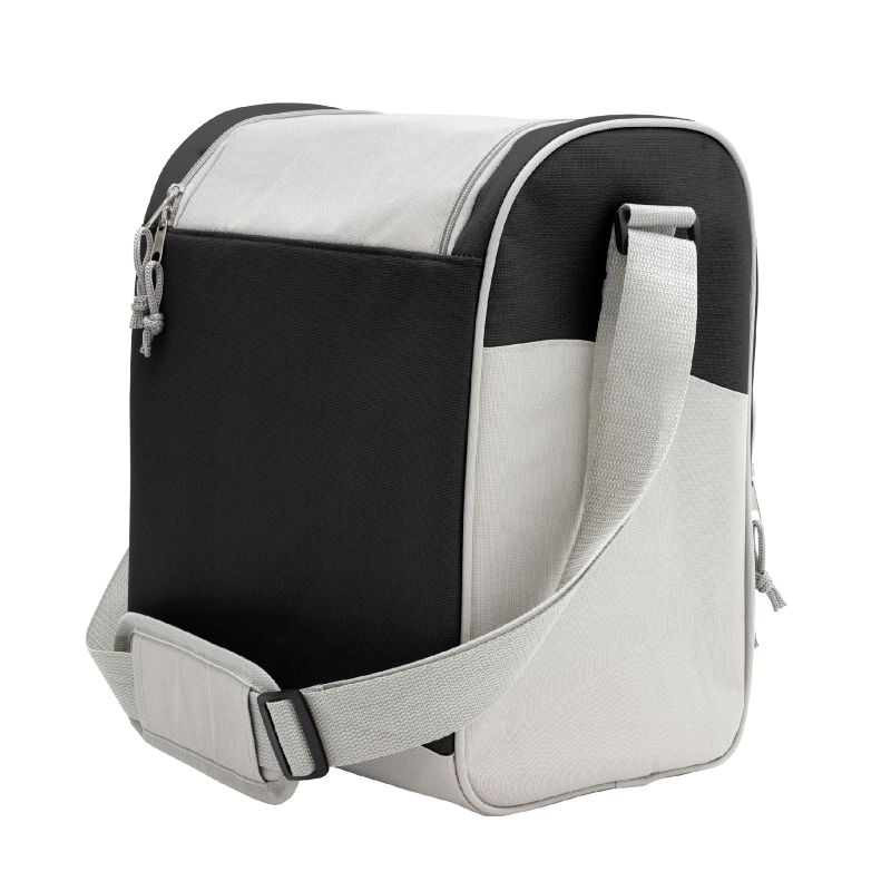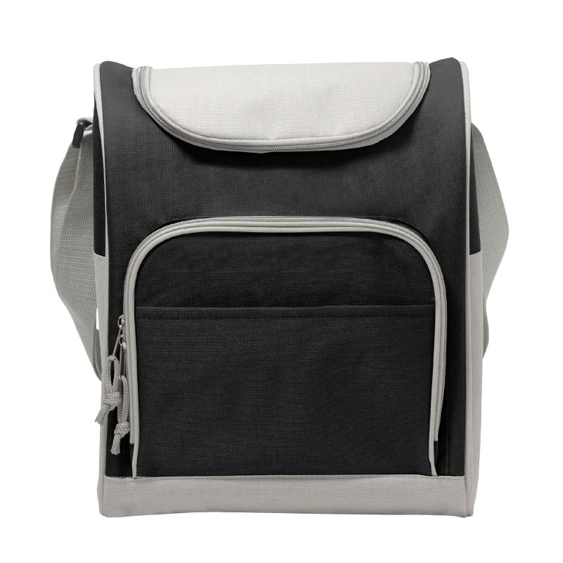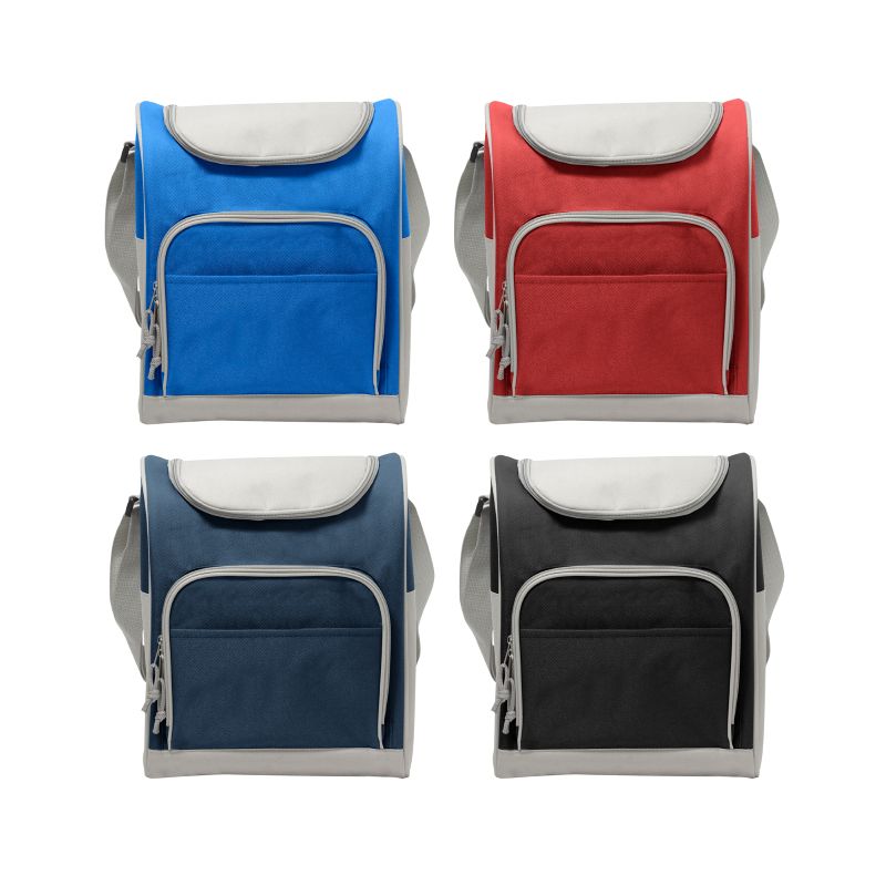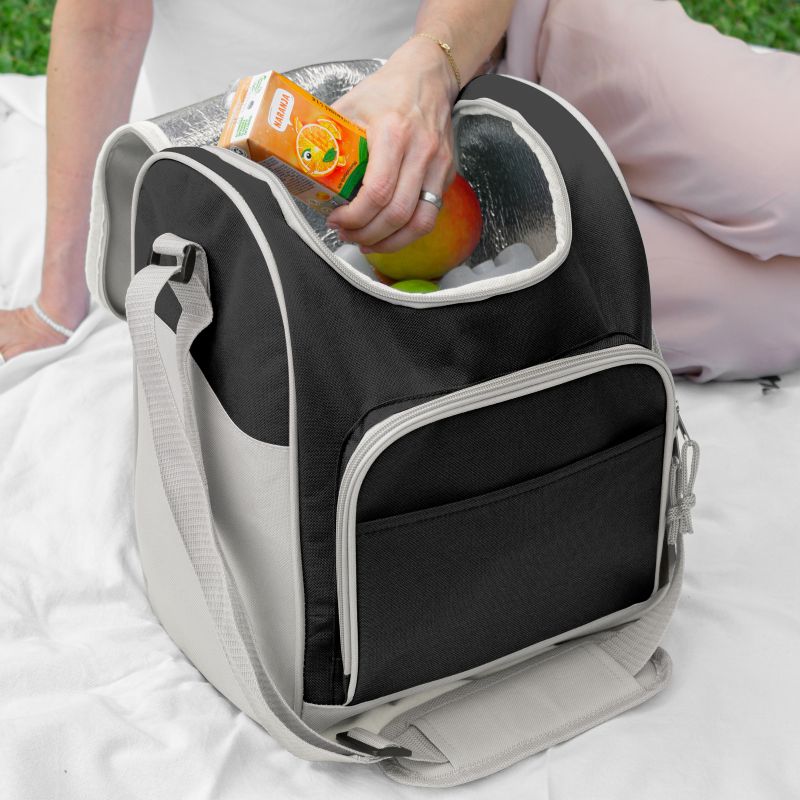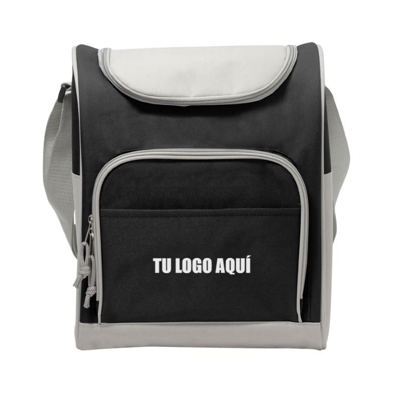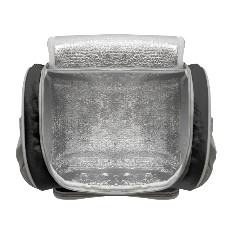 Bolso térmico exterior de poliéster 600D e interior totalmente recubierto de aluminio con cierre bidireccional.