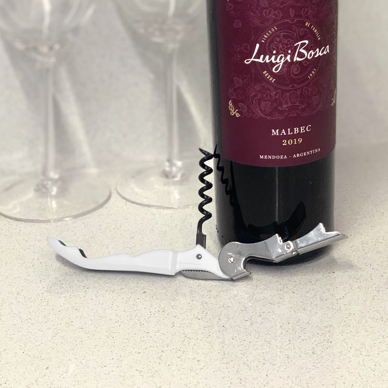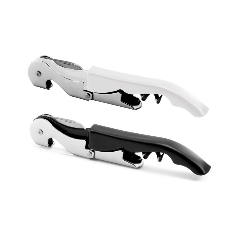 Sacacorchos de dos tiempos, en acero inoxidable (SS 420) y acero cromado con pintura de acabado mate y detalles en color plata.
