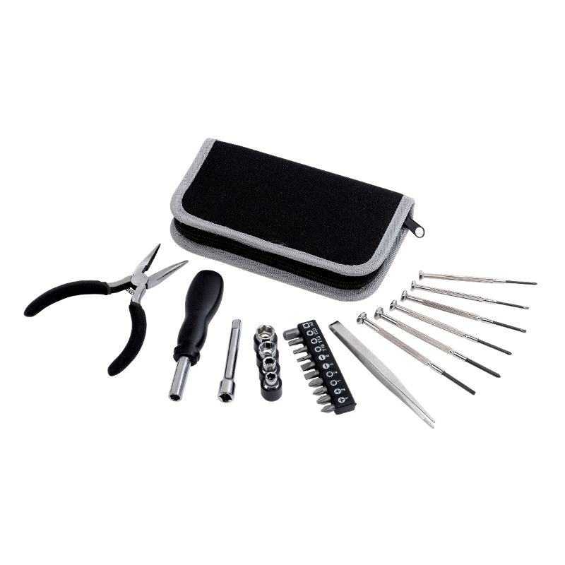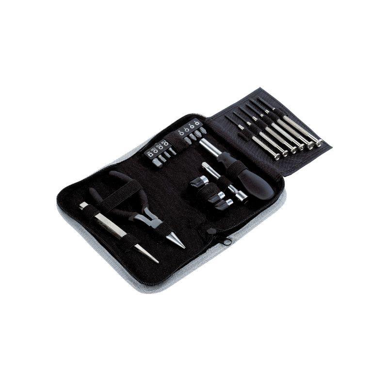 Incluye: pinzas, alicate de punta larga, 6 destornilladores de precisión, mango destornillador con alargue, 10 puntas intercambiables y 4 llaves tubo.
