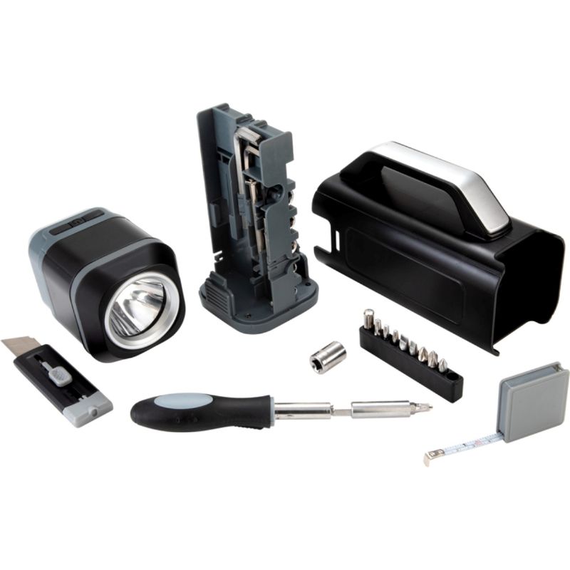 2 llaves hexagonales (Allen), 1 cúter de hoja ancha, 1 cinta métrica (de 1 metro), 2 destornilladores de precisión, 1 mango de destornillador, 1 barra de extensión, 1 conector, 9 puntas de destornillador y 6 llaves tubo.