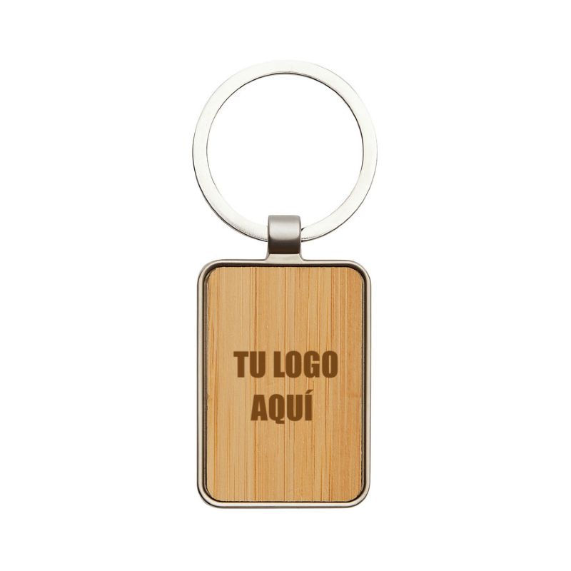 Llavero rectangular de estructura metálica con aleación de zinc de acabado brillante y panel frontal de bambú barnizado.
