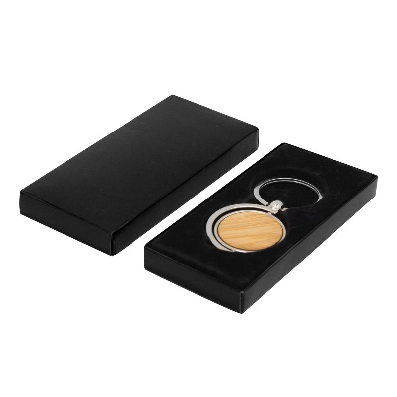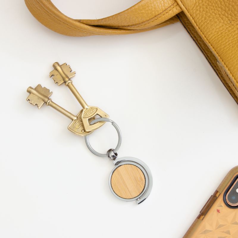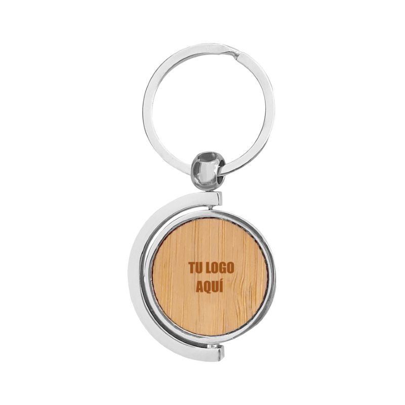 Llavero de estructura metálica giratoria 360° con panel circular de bambú.