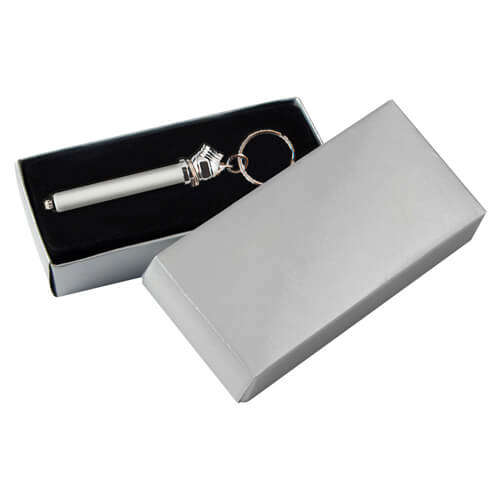 Presentación en caja de cartón laminado plateado con cuna aterciopelada.