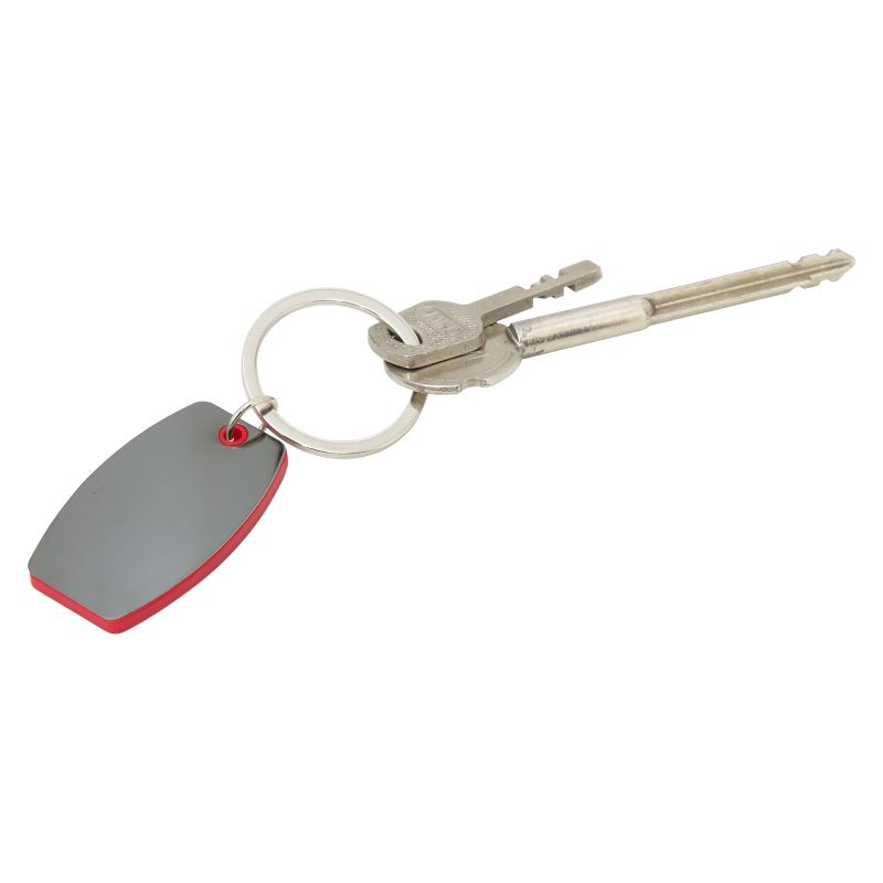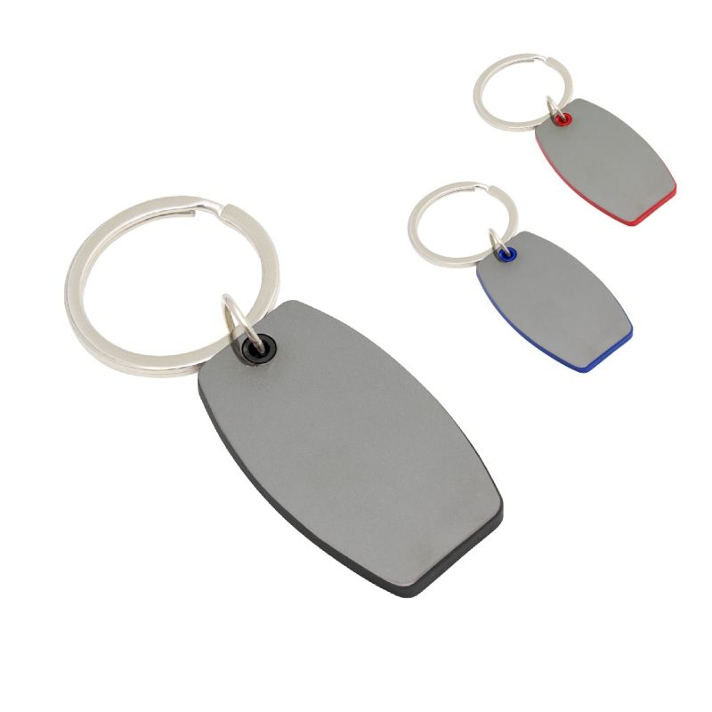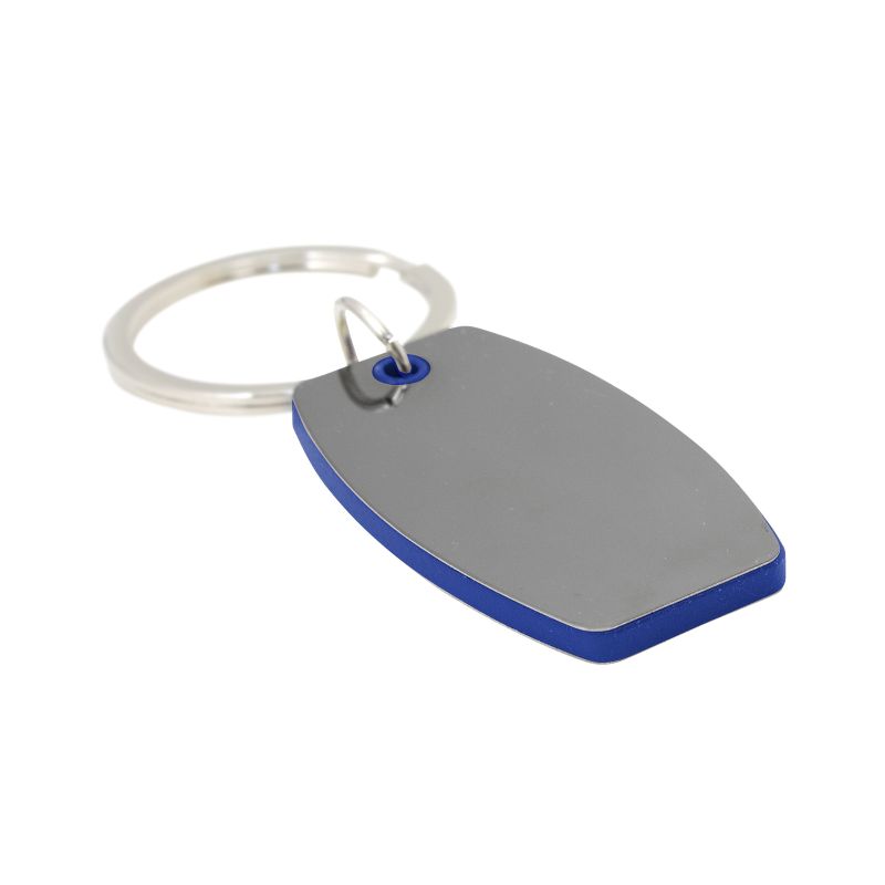 Llavero con estructura de plástico ABS de color con apliqués de acero color gris gun de acabado brillante a cada lado.