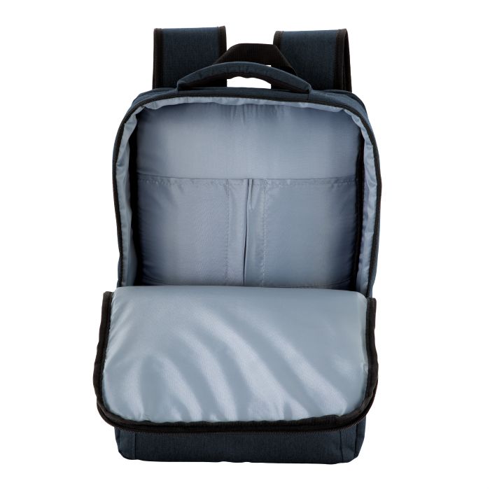 Compartimento posterior con cierre bidireccional, bolsillo para notebook de hasta 16 pulgadas con tira de seguridad con cierre de velcro y bolsillo plano con cierre.
