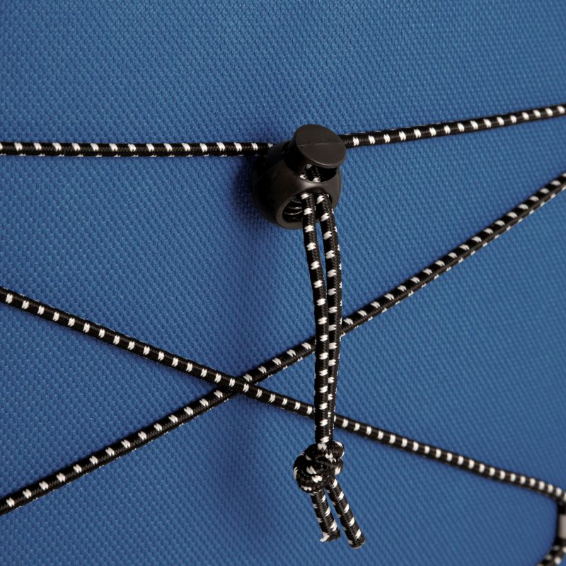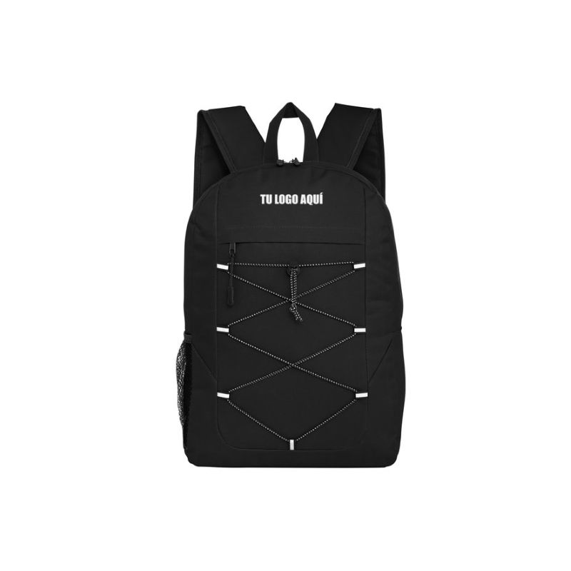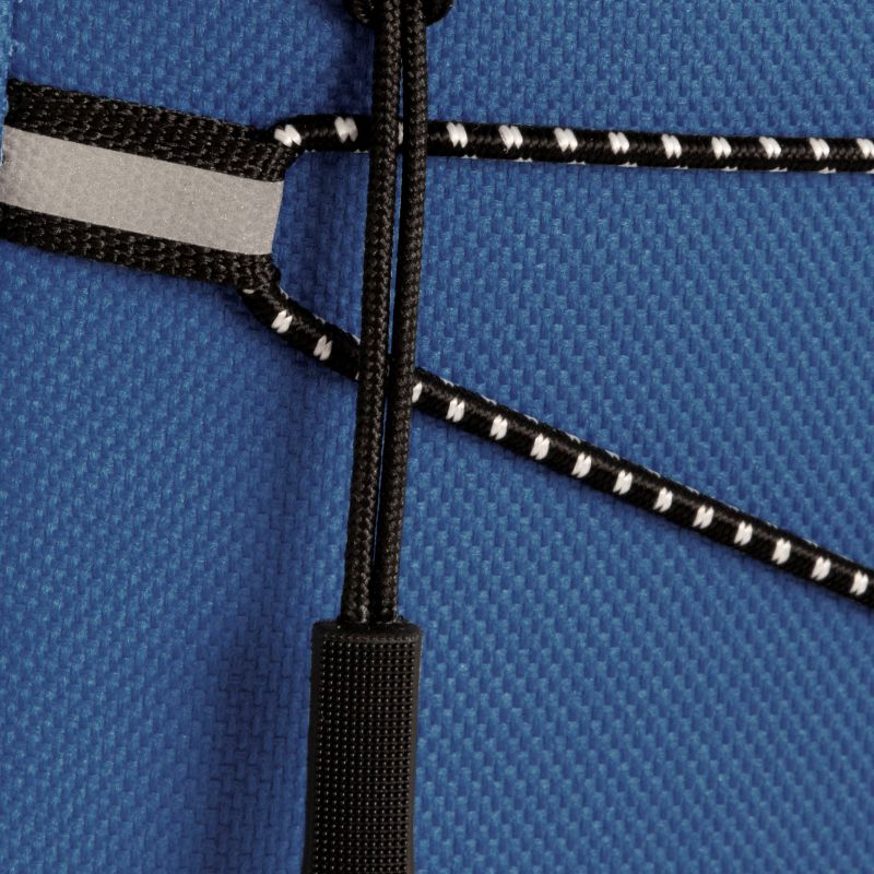 Frente con bolsillo de cierre horizontal, cordón elástico cruzado ajustable y detalles reflectivos.