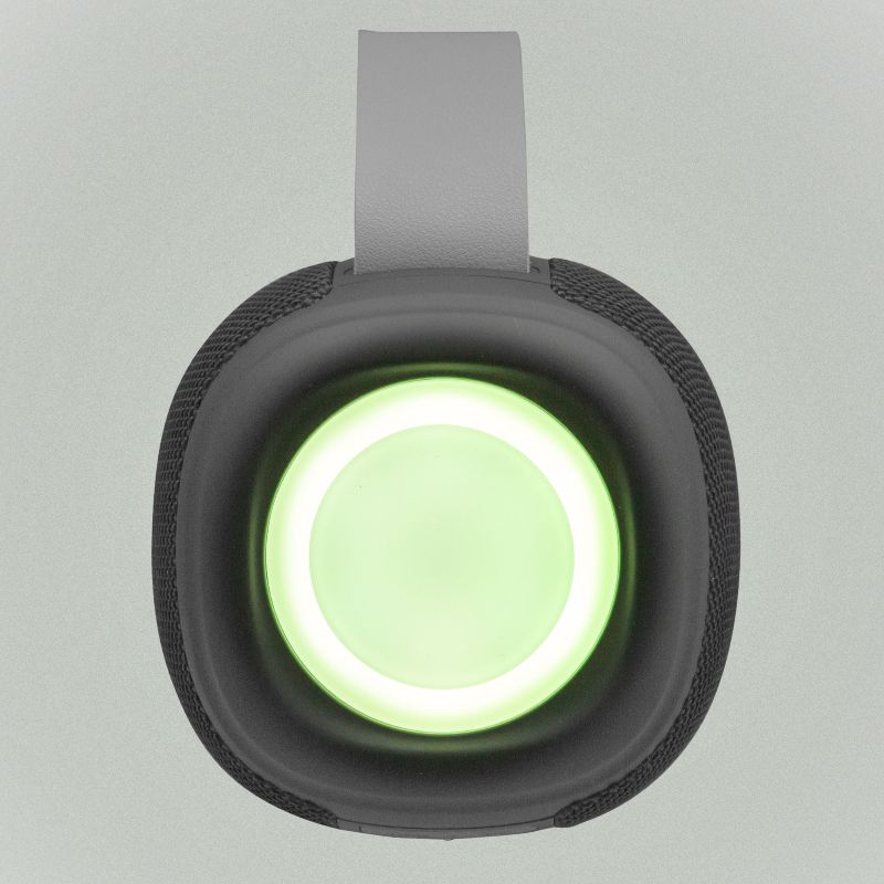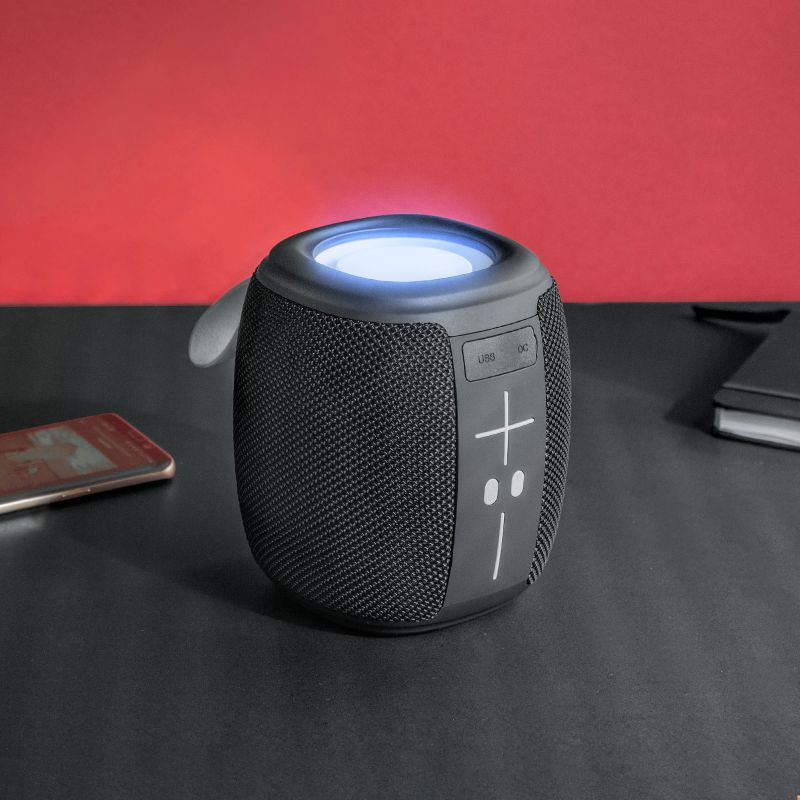 Parlante portátil Bluetooth v5.0 fabricado en plástico ABS, silicona, poliuretano y tejido resistente al agua.