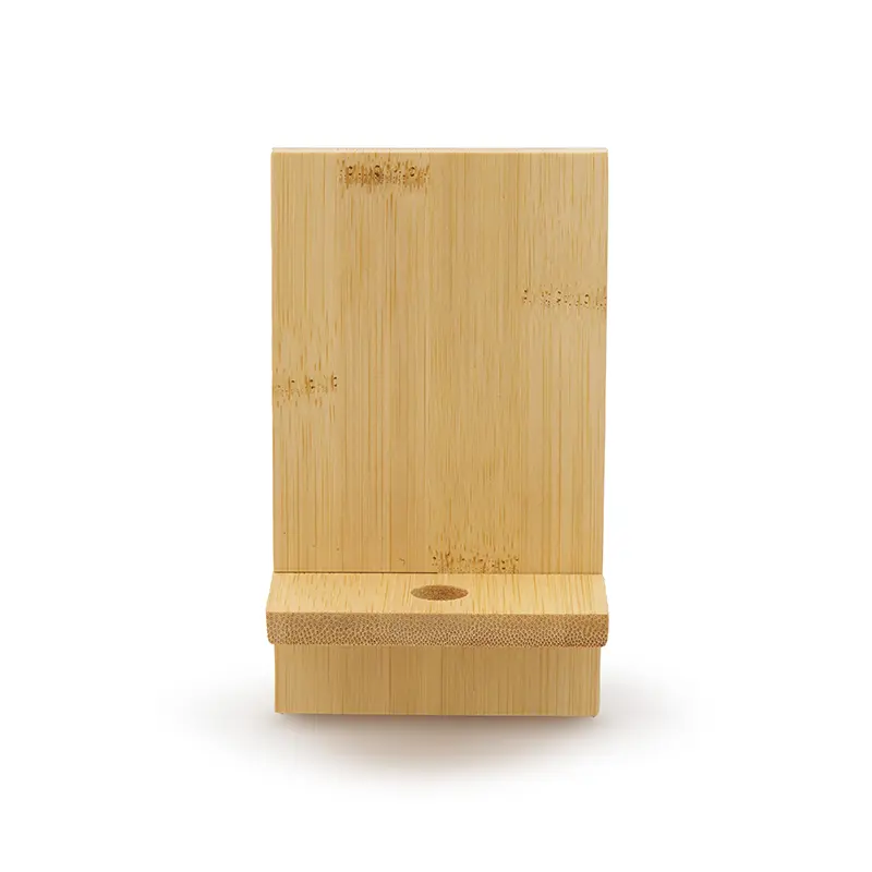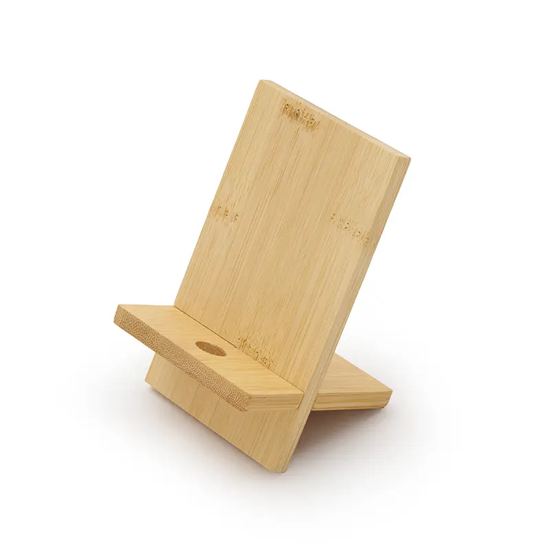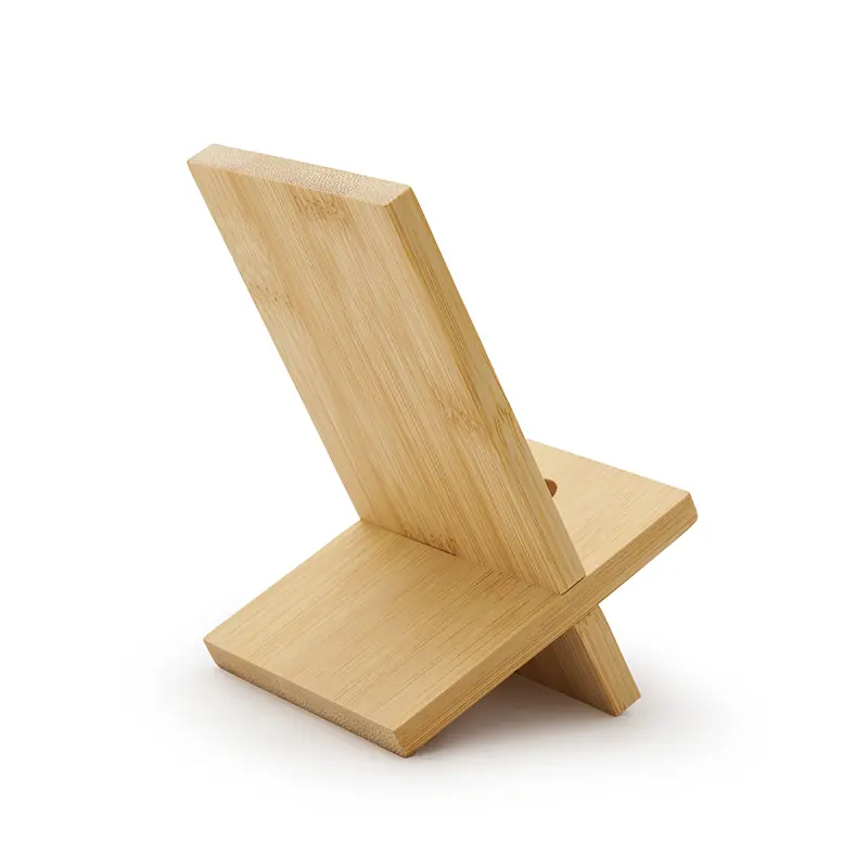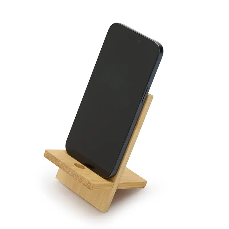 Soporte desmontable para teléfono fabricado en madera de bambú.